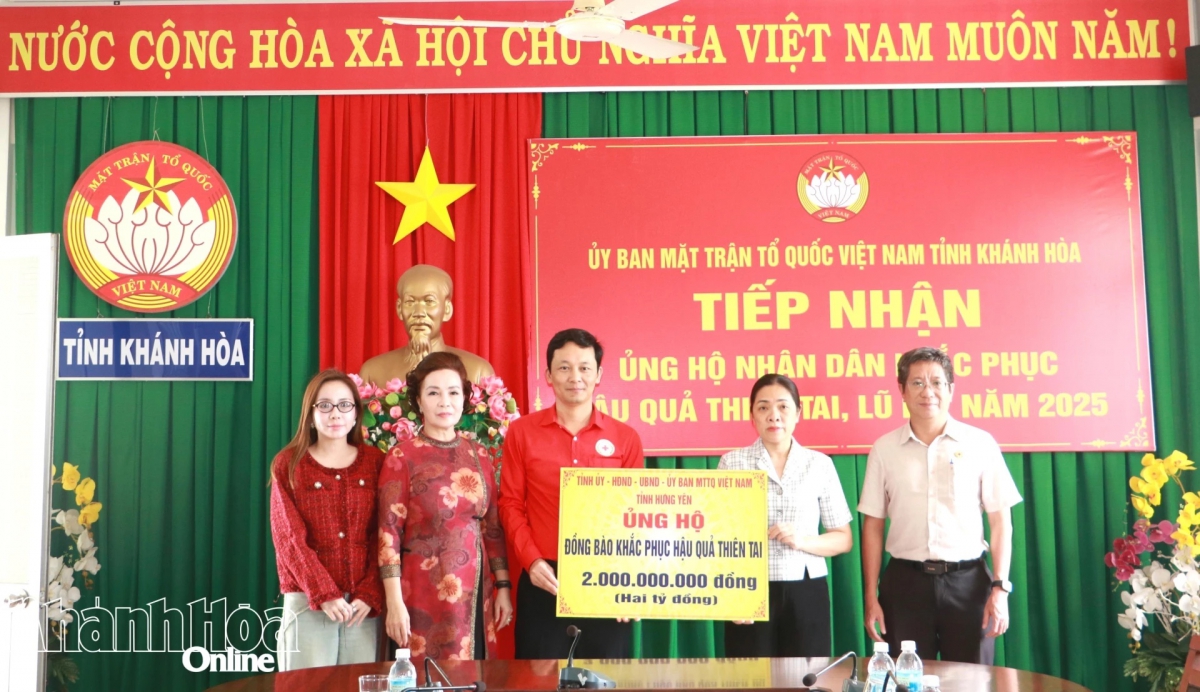 Đoàn công tác của tỉnh Hưng Yên trao tượng trưng số tiền 2 tỷ đồng hỗ trợ Nhân dân tỉnh Khánh Hòa khắc phục hậu quả do thiên tai gây ra.