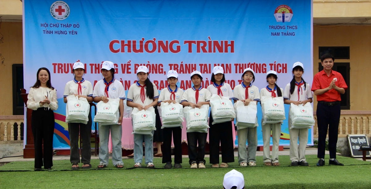 Hội Chữ thập đỏ tỉnh trao tặng đồ dùng học tập cho học sinh Trường THCS Nam Thắng tại chương trình.