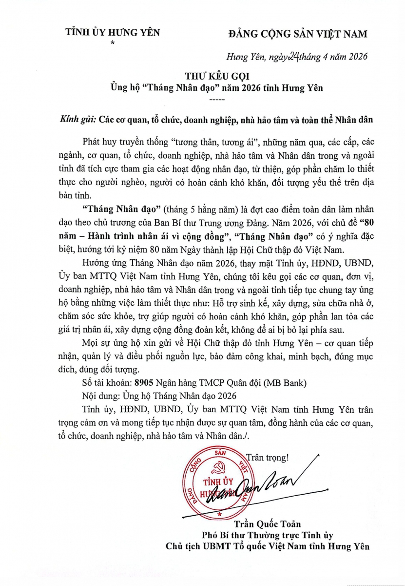 Hưởng ứng “Tháng Nhân đạo” với chủ đề “80 năm – Hành trình nhân ái vì cộng đồng”, tỉnh Hưng Yên kêu gọi các cơ quan, đơn vị, doanh nghiệp và toàn thể Nhân dân cùng chung tay sẻ chia, giúp đỡ những hoàn cảnh khó khăn, lan tỏa tinh thần “tương thân tương ái”.